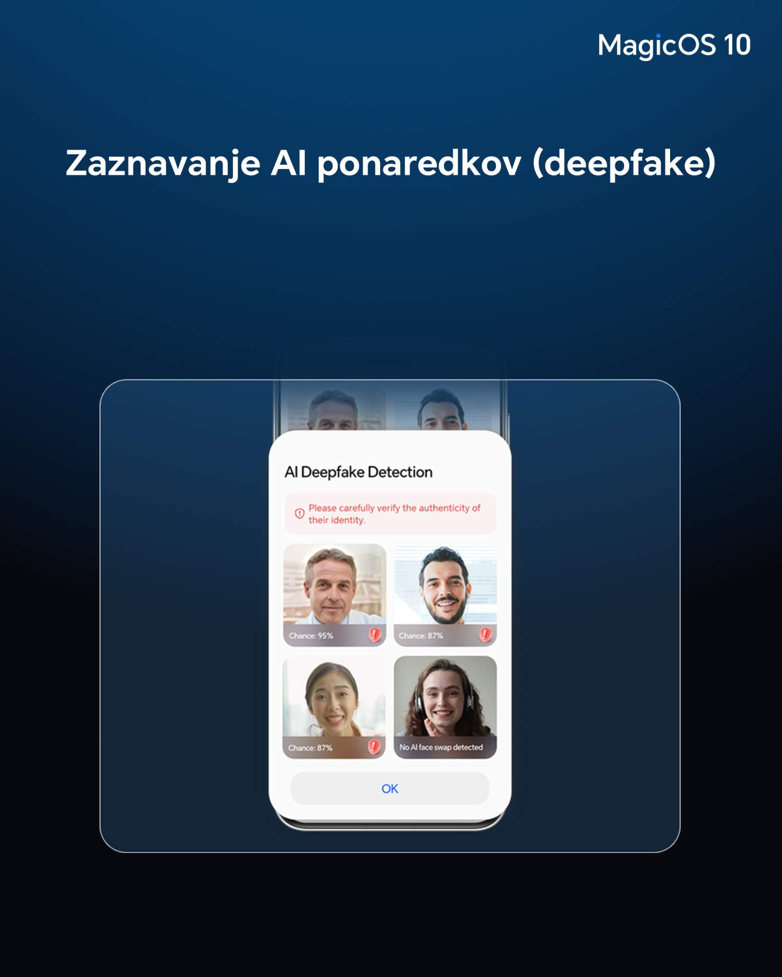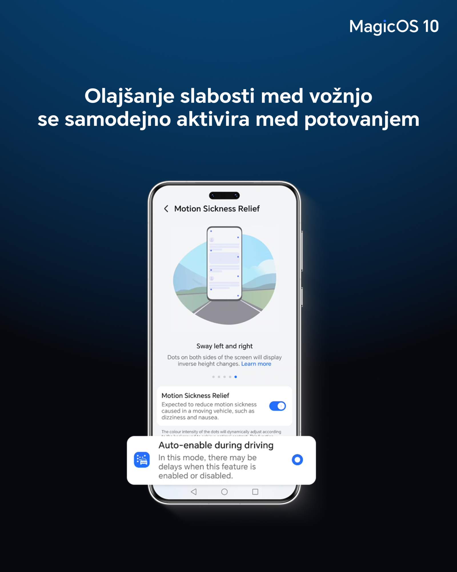 MagicOS 10 predstavlja tudi funkcijo lajšanja potovalne slabosti, ki se samodejno aktivira med vožnjo, da zmanjša vizualno nelagodje in podpira udobnejšo uporabo naprave na poti. Na področju varnosti AI Deepfake detekcija uporablja inteligentno analizo za prepoznavanje potencialno manipuliranih medijev in zaščito uporabnikov med video sestanki ali deljenjem vsebin. Za zvok MagicOS 10 dodaja podporo za visokoločljivostne formate Bluetooth, ki zagotavljajo polnejši zvok, ko so združeni z združljivimi slušalkami.