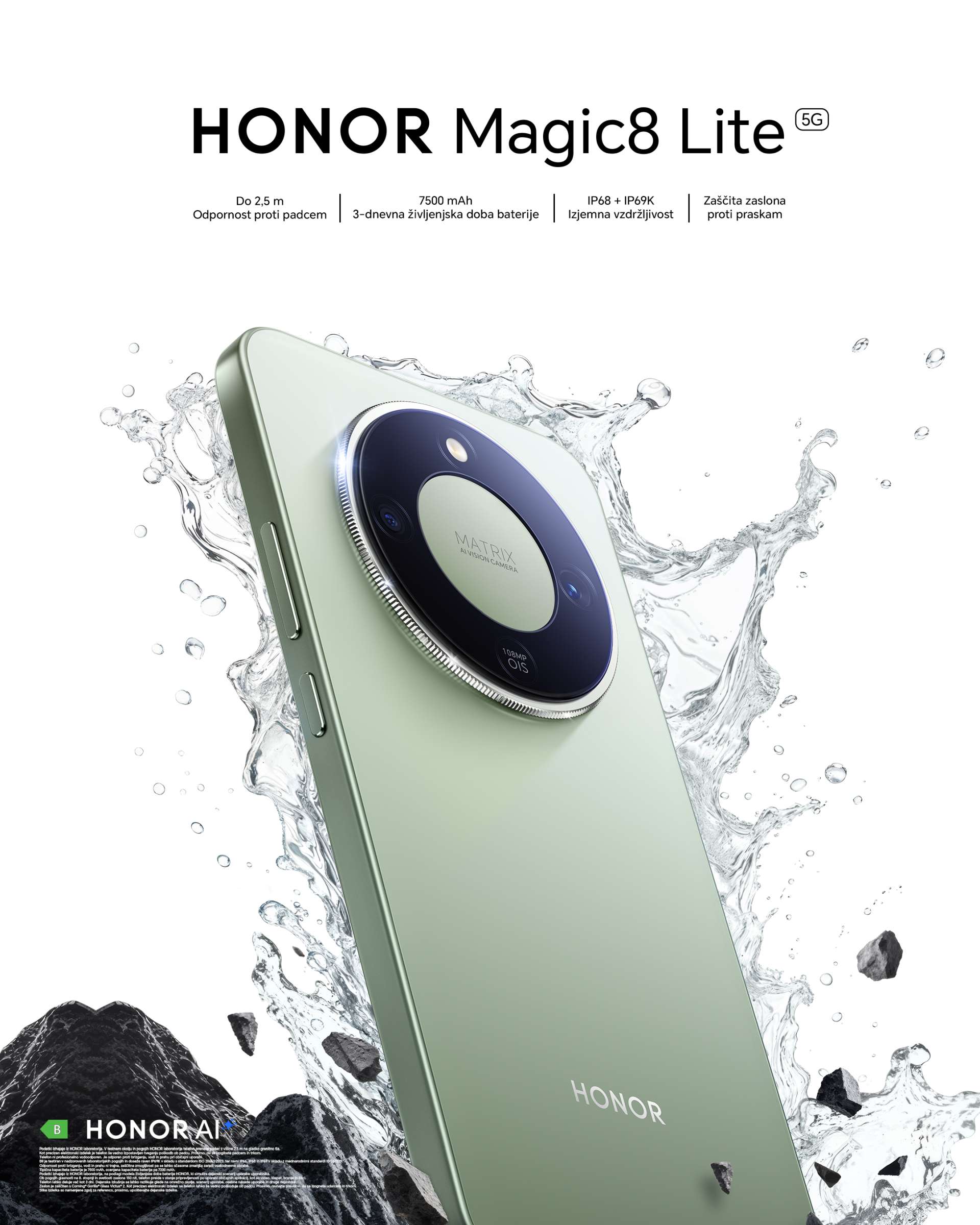 HONOR Magic8 Lite izstopa z nadpovprečno vzdržljivostjo za pametni telefon srednjega razreda. Opremljen je s certifikatoma SGS Triple Resistant Premium Performance in SGS 5-Star Comprehensive Reliability, podpira odpornost proti padcem do 2,5 metra ter zaščito pred vodo in prahom po standardih IP68 in IP69K. Naprava je zasnovana za zanesljivo delovanje v zahtevnejših vsakodnevnih pogojih.