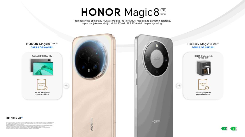 Ob lansiranju so kupci deležni posebnih ugodnosti. Med 15. januarjem in 28. februarjem 2026 prejmete ob nakupu HONOR Magic8 Lite cvrtnik na vroč zrak HONOR Choice in 365 dni brezplačnega popravila zaslona.