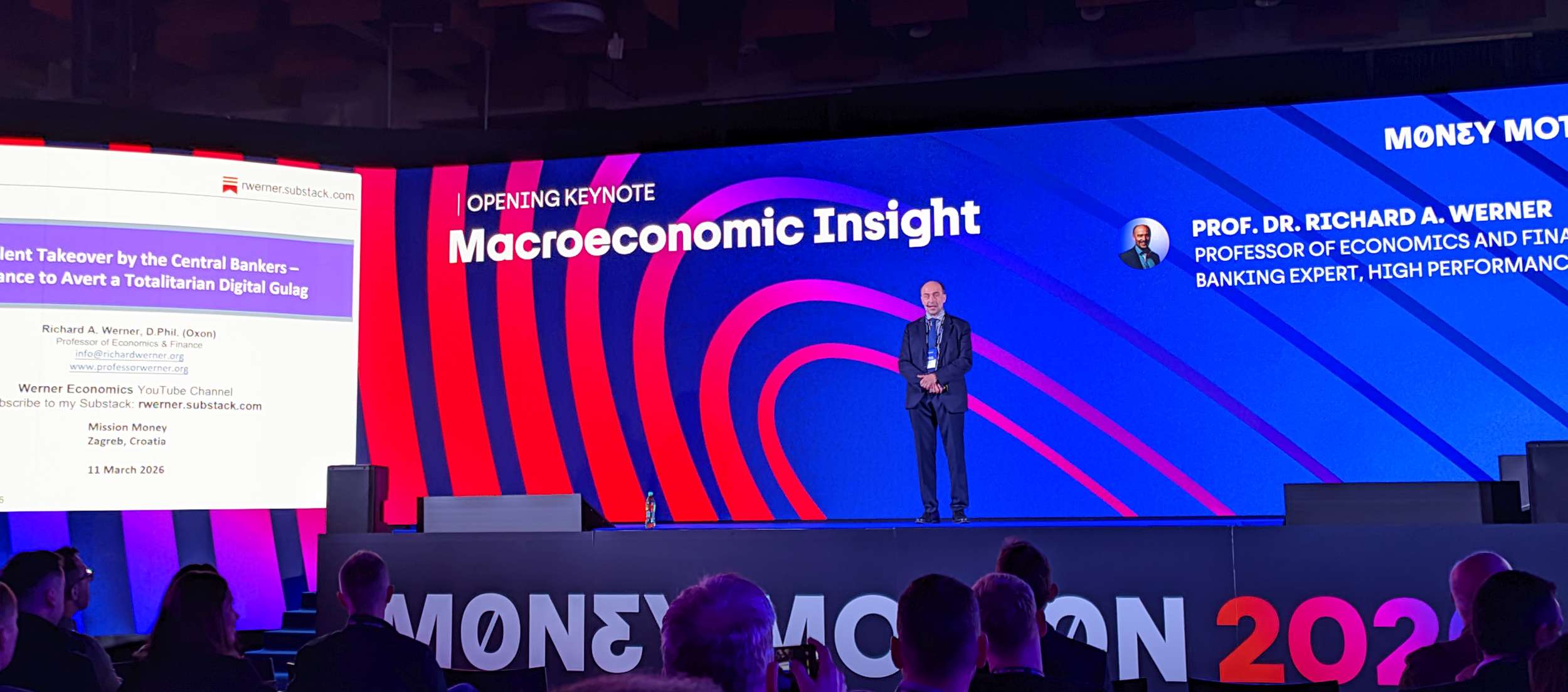 Sledilo je predavanje, ki mu je uspelo ustvariti kurjo polt – verjetno ne zgolj pri meni. Prof. dr. Richard A. Werner je podal ostro kritiko trenutnega delovanja centralnih bank (ECB, IMF, Svetovna banka) in opozoril na t. i. totalitarni digitalni gulag, kot se je slikovito izrazil.