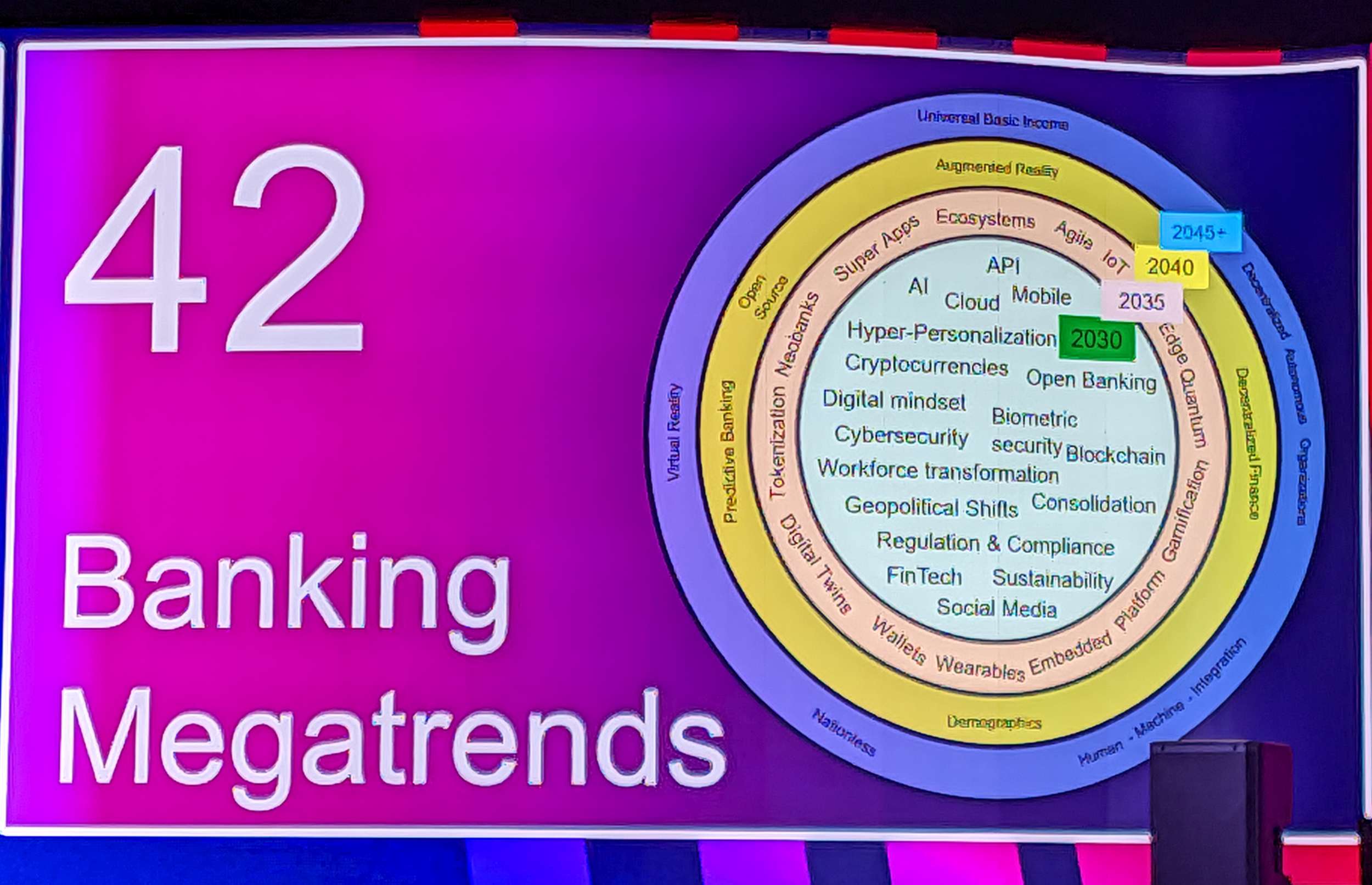 V nadaljevanju je Frank Schwab je predstavil vizijo bančništva, ki presega zgolj digitalne aplikacije in se seli v sfero hiperpersonalizacije in kvantnega računalništva. Čeprav je med bliskovitim prehodom predstavil kar 42 bodočih trendov, so mojo pozornost zares pritegnili le štirje, in sicer: