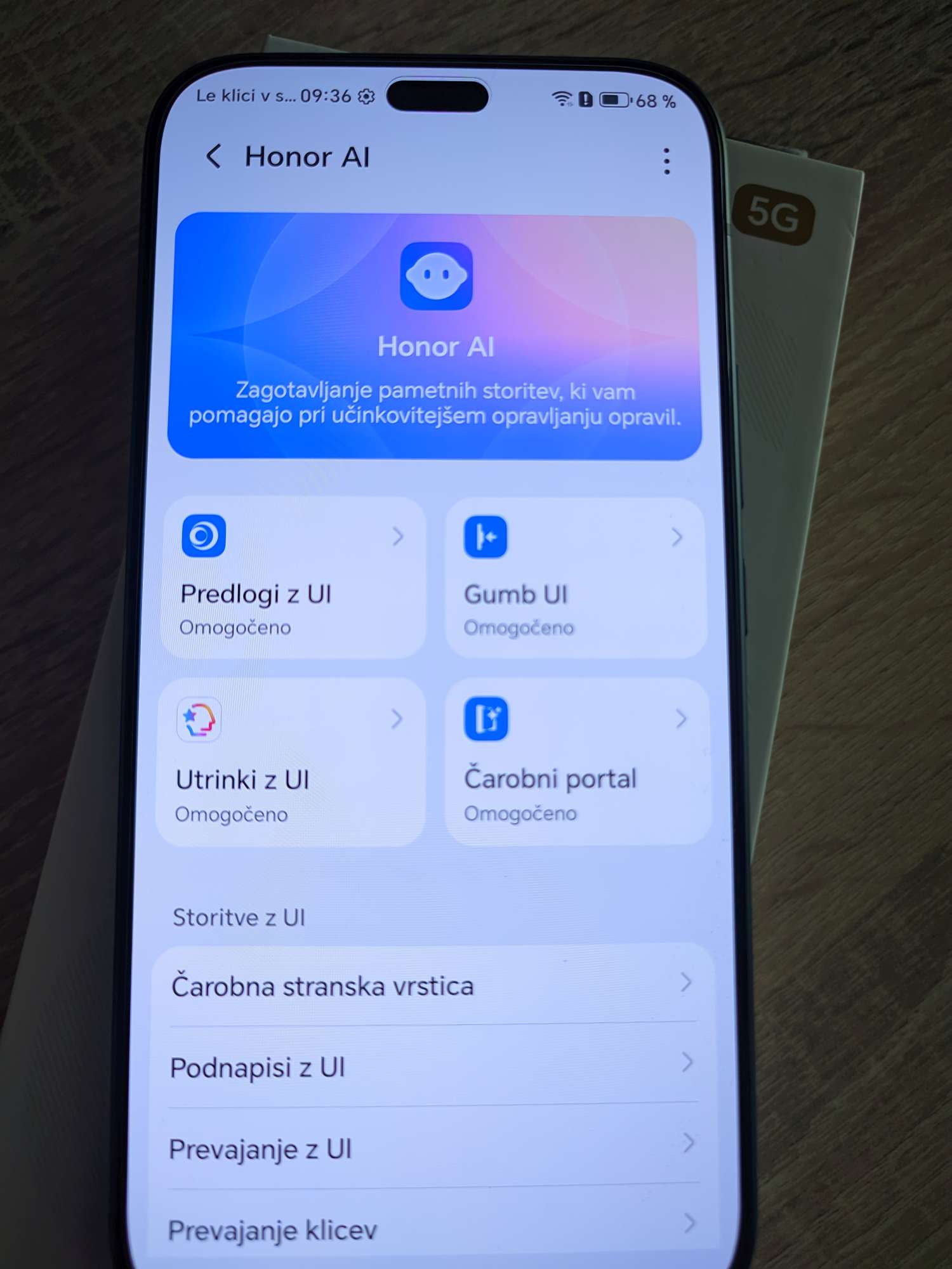 Čeprav slednje ne spada dobesedno v razdelek »zmogljivosti«, pa ima izjemen vpliv na dojemanje telefona. HONOR je na desno stran ohišja vgradil fizični »AI-gumb«. Tega lahko nastavim za hitri sprožilec kamere ali za priklic hišne »AI-asistence« v številnih aplikacijah. Umetna inteligenca (vgrajena v sistem MagicOS 10) tukaj ni le marketinški trik; funkcije, kot je prepoznavanje vsebine na zaslonu in takojšen prenos v aplikacije (Magic Portal), so resnično dozorele. Upam staviti, da bo ta gumb zelo hitro dobil posnemovalce – ker preprosto deluje.
