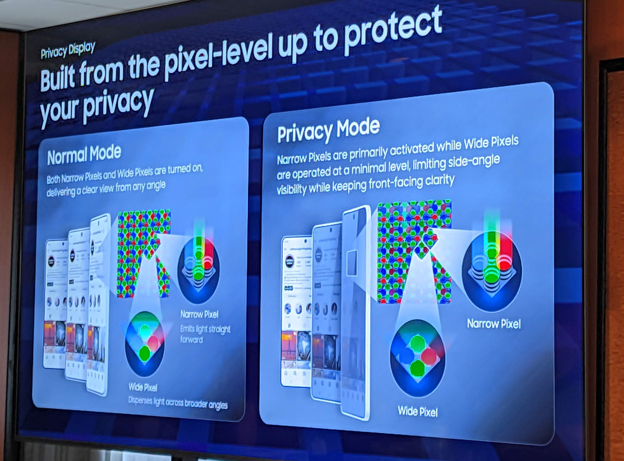 Zaslon je zvezda Samsungovega zastavonoše, že od nekdaj, letošnji model pa je letvico dvignil še precej višje. Največja novost modela Galaxy S26 Ultra je tehnologija Flex Magic Pixel, ki omogoča preklapljanje med različnimi vrstami slikovnih pik (ozkimi in širokimi), vgrajenimi v povsem nov zaslon AMOLED. Gre za strojno rešitev, ki ob vklopu drastično zmanjša kote gledanja, kar v praksi pomeni večjo zasebnost, saj na zaslon dobro vidi le uporabnik, ki v zaslon, poimenovan kar Privacy Display, gleda naravnost, »firbci«, ki kukajo s strani pa bodo ostali z dolgim nosom.
